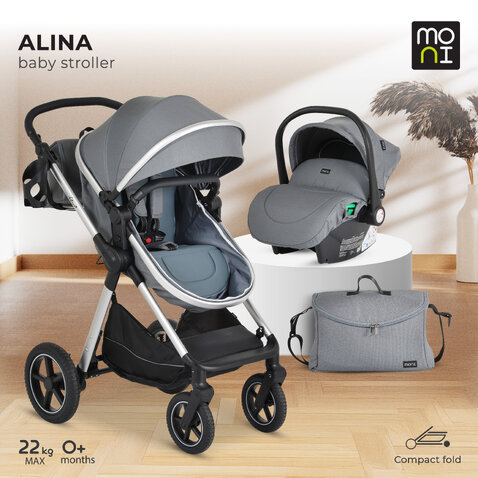 Moni Alina kolica za decu su idealna za sve roditelje koji cene udobnost, praktičnost i funkcionalnost. Kolica imaju lagan i izdržljiv ram sa amortizerima na točkovima koji osiguravaju glatku i nesmetanu vožnju. Kolica su kombinovanog tipa, te se sportsko sedište transformiše u meku korpu sa ravnim položajem, idealnim za novorođenčad od prvog dana. Model Alina je pogodno smestiti decu težine do 22kg.