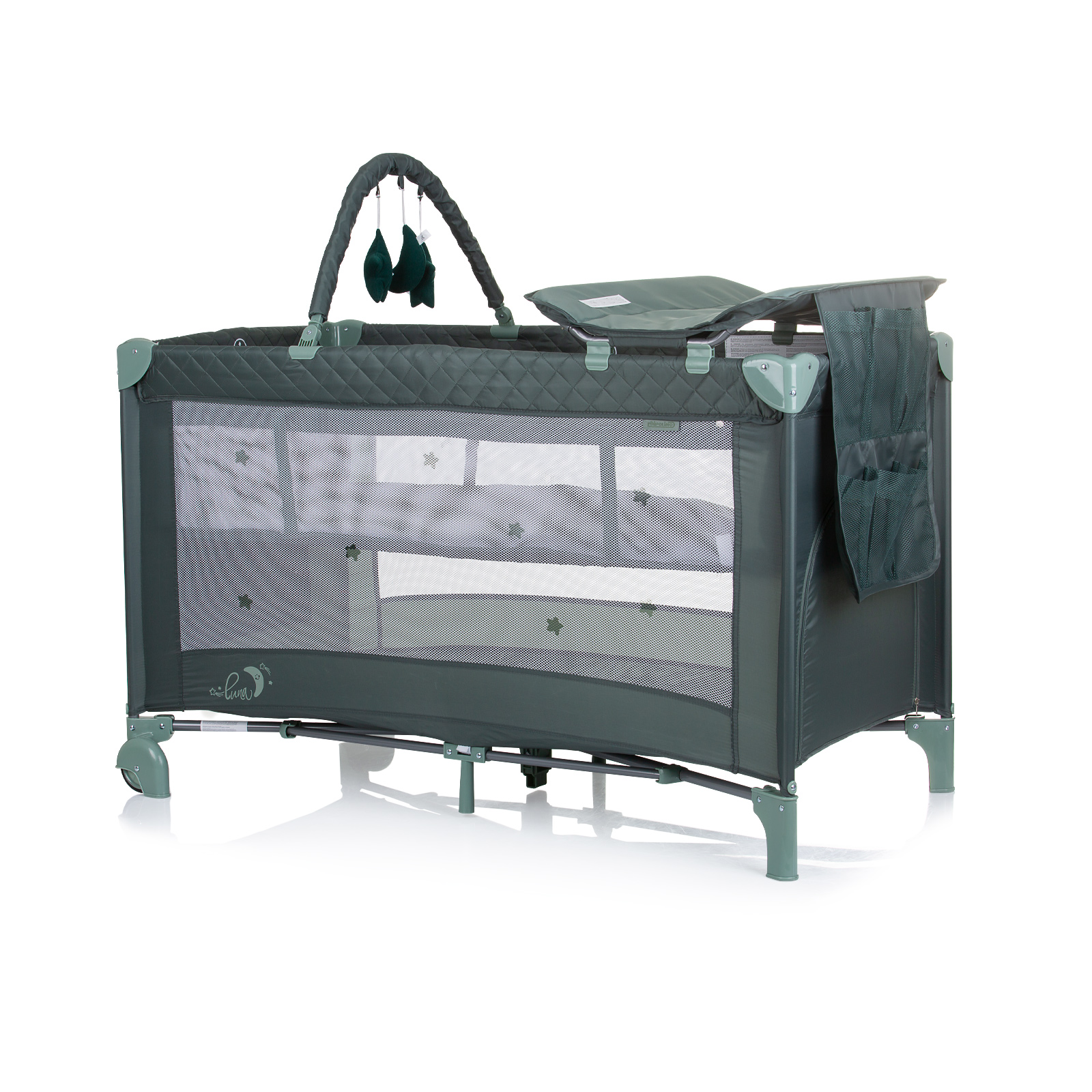 Chipolino Luna prenosivi krevetac je pogodan za novorođenčad i decu težine do 15 kg. Set sadrži: Prenosivi putni krevetac; Mekana podloga na drugom sloju; Prostirku koja se menja; Poluga sa tri plišane igračke; Torba za nošenje i skladištenje. Garancija 24 meseci